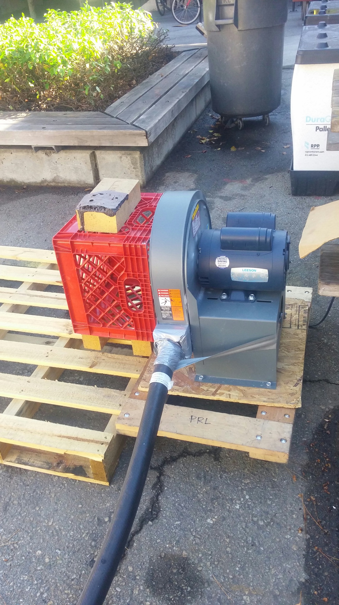 We use a single large burner with a rated capacity of 400,000 BTU/hour (Pyronics NM-301), fueled by LPG propane. The burner requires a fairly large combustion blower to provide air. In the photo below, the red plastic thing is a standard milk crate; this burner is pretty much the largest thing we could find that runs off of standard single-phase 110V electric. The blower has an intake into which one can feed ash, just like in Steve’s kiln.