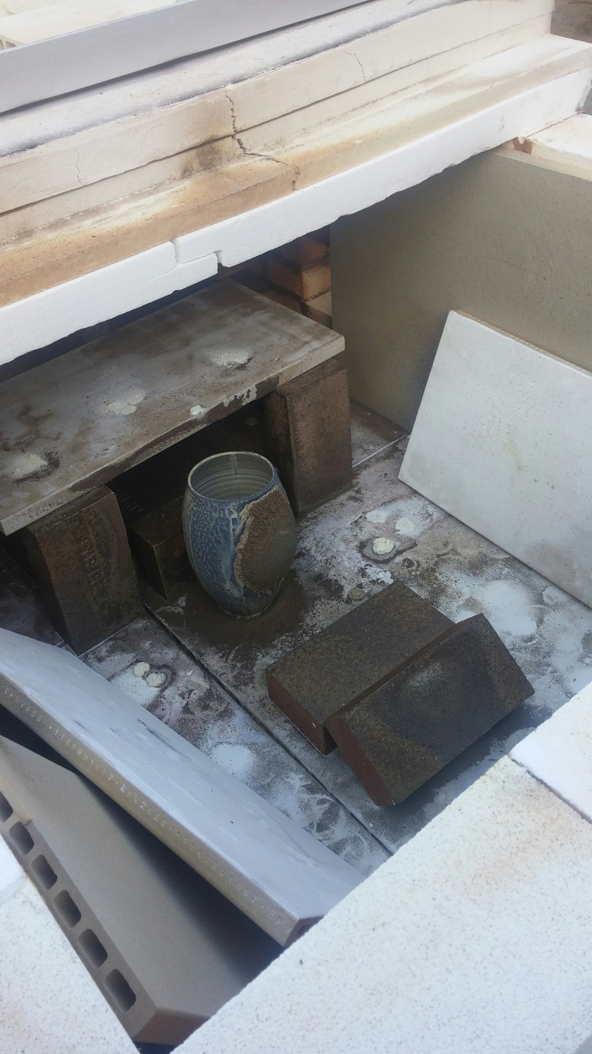 Here are a couple of photos of the stacking area, first with and then without pots. As you can see there is one pot that was previously fused onto the floor shelves and we’re leaving it there as a sort of bag-wall.