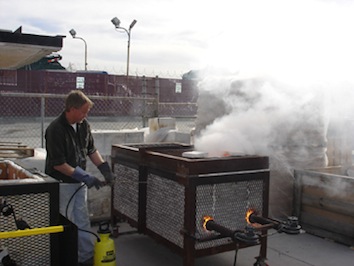 The burner system is a double blower set up that fires on 3 pounds of propane pressure. A clear path in front of each blower burner is open down the length of the two side walls. Flames and heat to travel to the back of the kiln and then over the top of the upper wares and exits through the lid flue.